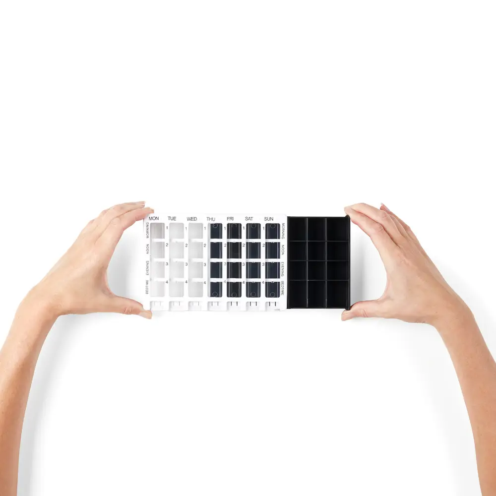 With the convenience of this pill organiser and its helpful distinctions, you’ll have peace of mind that all dosages are met without confusion or missing doses. Everything you need for taking your daily medication can fit in one container.