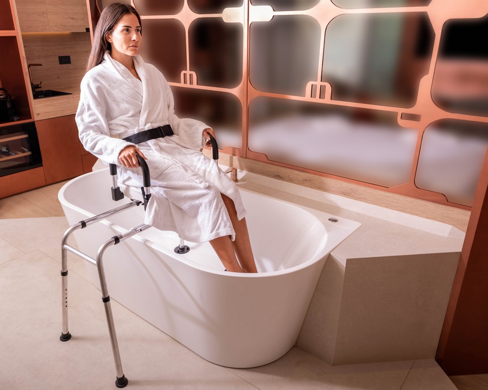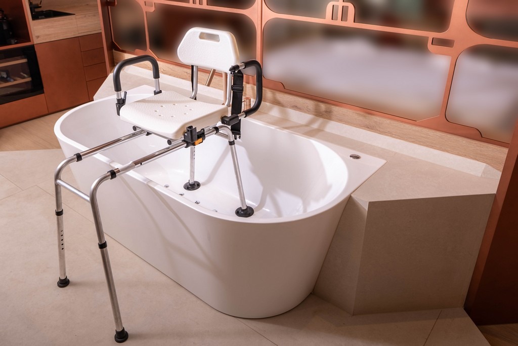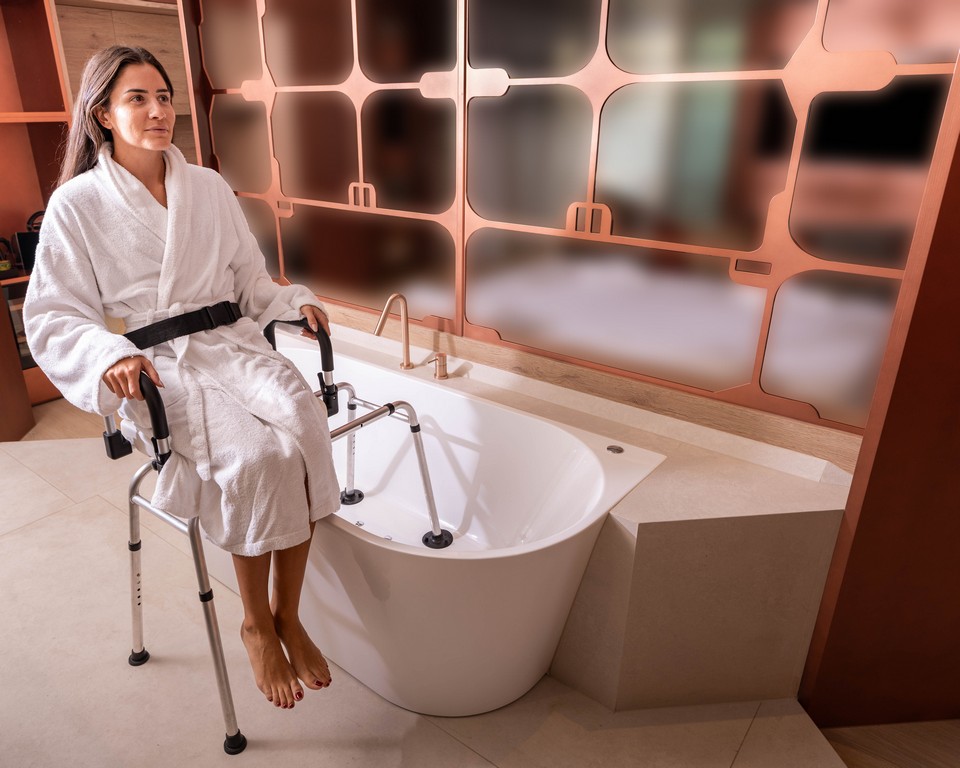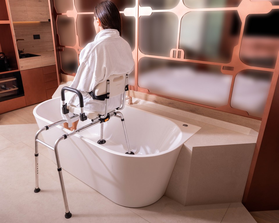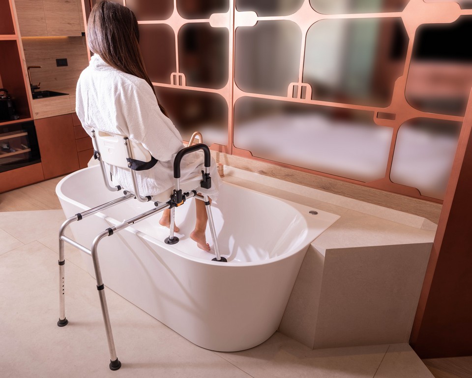 Our bench features a 360° swivel seat that locks every 90°, combined with a smooth sliding rail system. This allows the user to sit down outside the tub and glide safely over the side, eliminating the need to step over high bathtub walls.